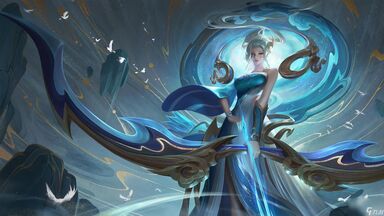 2、這款皮膚的外觀造型十分帥氣,以諸葛亮為原型,融合了水墨古風(fēng)元素,一頭潔白的銀發(fā)尤其吸晴,身邊還有一把寶劍。