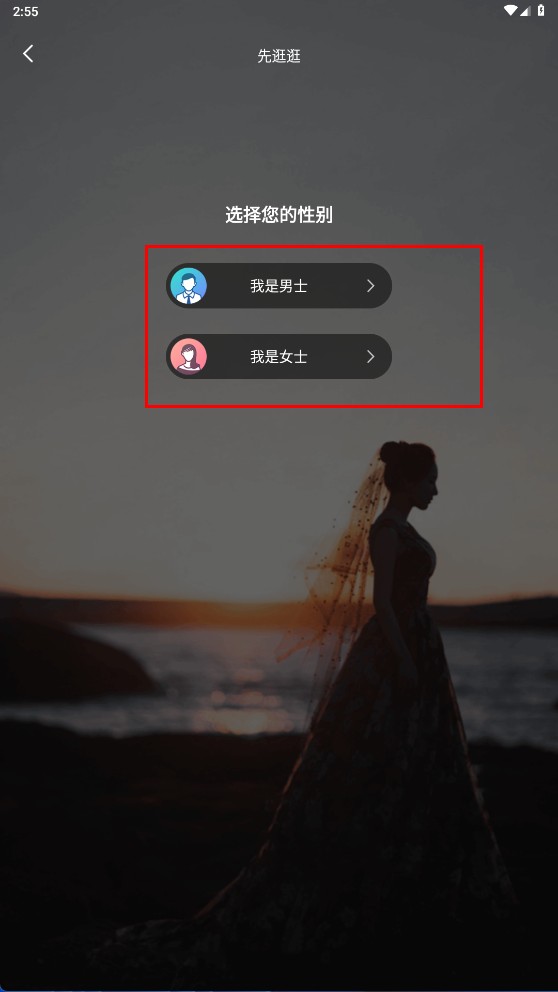 打開一伴婚戀應用后,完成登錄操作進入性別選擇頁面,點擊“我是男士”或“我是女士”選項即可完成性別設置。