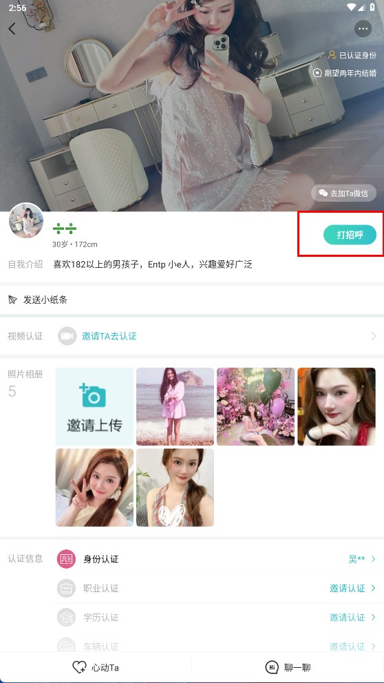 進入異性用戶的詳細資料頁面后,點擊【打招呼】按鈕,即可向對方發送消息以表達想要交流的意愿。