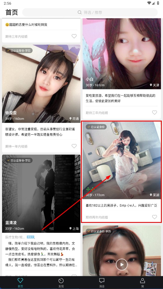 進入一伴婚戀【】主頁,瀏覽多位異性用戶的資料卡片,查看他們的照片、年齡、身高以及認證信息。