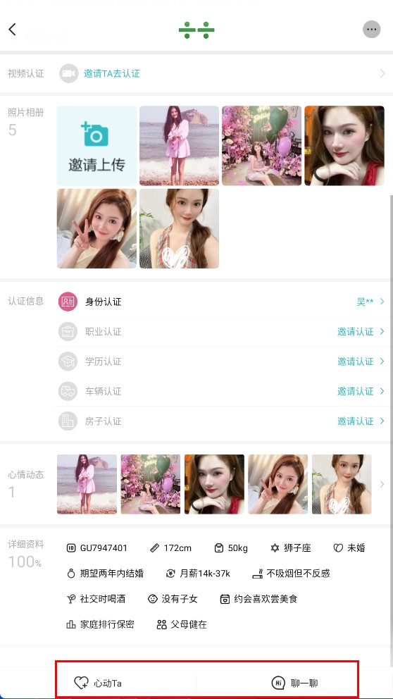 在異性用戶的詳細資料頁面里,找到【心動TA】和【聊一聊】這兩個按鈕,然后和對方進行交流溝通。