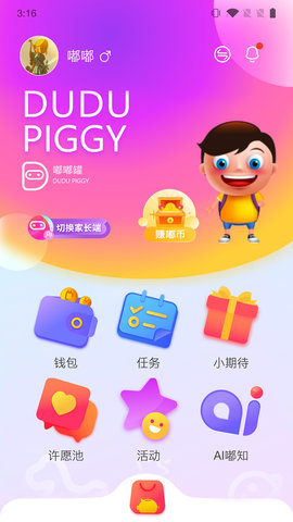 最受關注的功能之一當屬【錢包-兒童電子儲蓄罐】。該功能作為一款實用的電子儲蓄工具,通過記賬的方式清晰呈現孩子的財務狀況。家長借助此功能能夠輕松管理孩子的零花錢,并且全程無需充值操作,安全性與可靠性更有保障。 另一項核心功能是【AI嘟知-兒童AI問答】,目前該功能正處于測試階段。它是專門面向兒童的人工智能問答專區,孩子可以在這里向機器人發起提問,與AI展開互動對話。此功能的設計初衷是助力兒童提升財商素養、養成良好習慣,讓他們在與人工智能的交流中獲取有益的知識和信息。