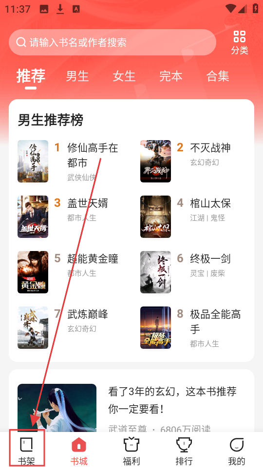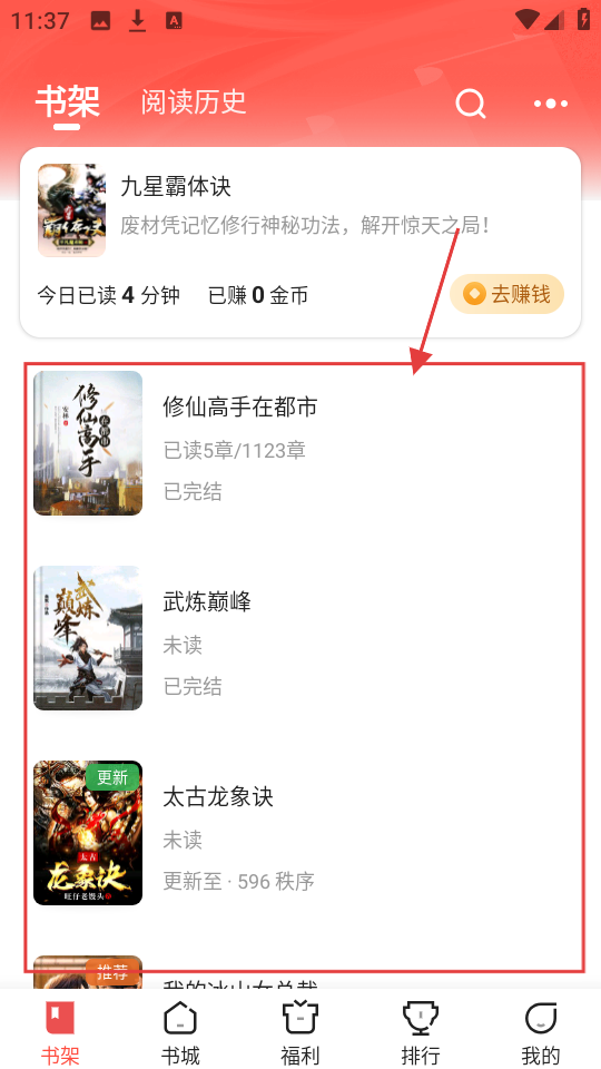 在書架頁面,你可以查看已經(jīng)添加到書架里的小說列表,像《修仙高手在都市》這類作品都能看到哦。