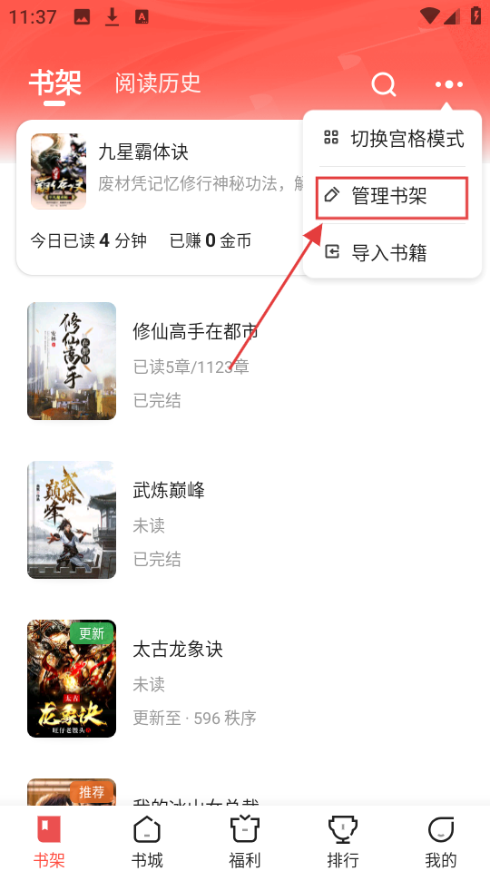 點擊右上角的三點圖標,接著選擇【管理書架】這一選項,就能進入書架管理模式啦。