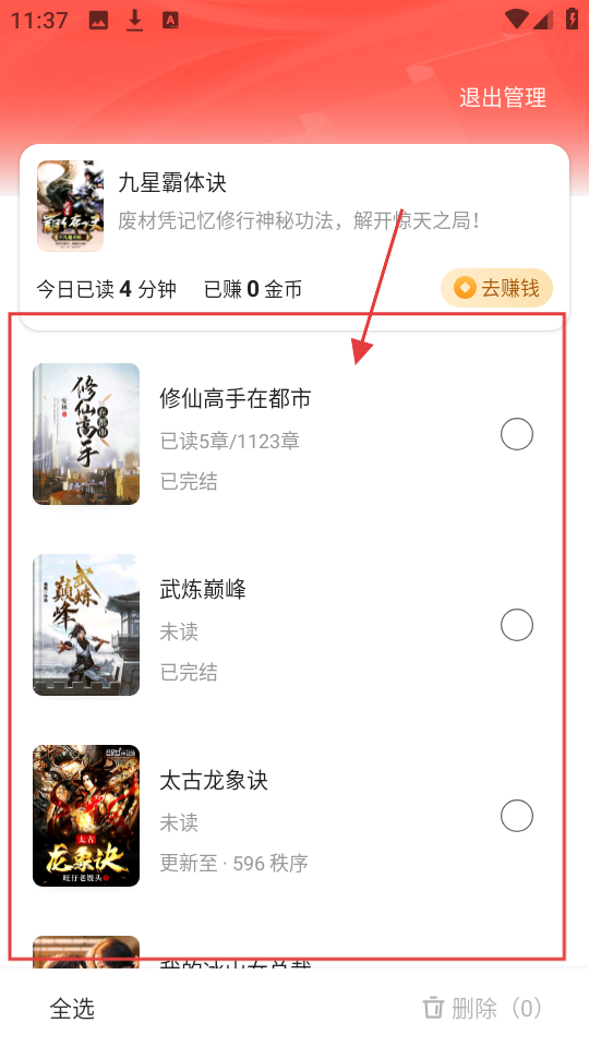 進入管理模式后,就能對書架里的小說進行選擇操作,這樣整理書架內(nèi)容會更方便哦。